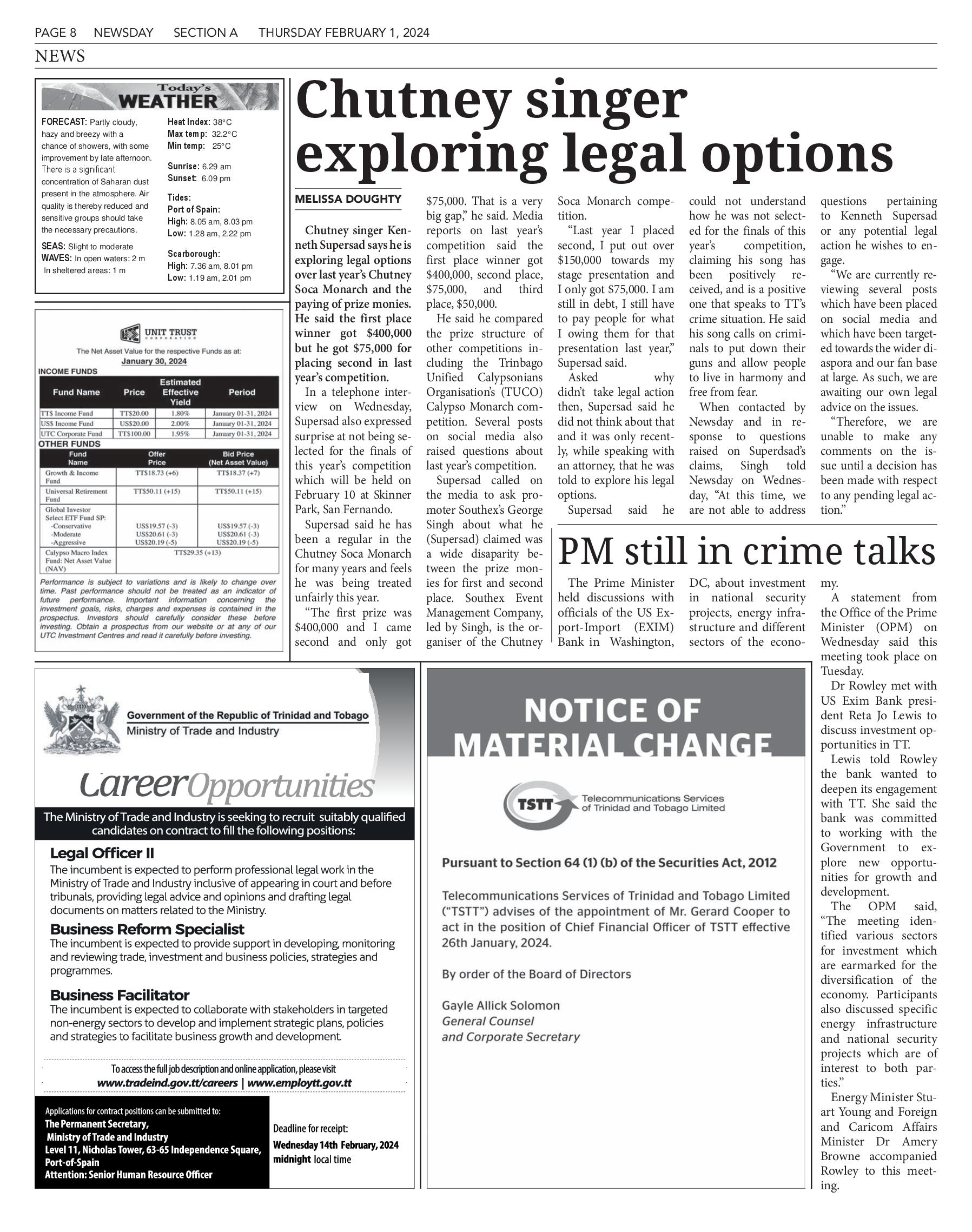 The Prime Minister held discussions with officials of the US ExportImport (EXIM) Bank in Washington, DC, about investment in national security projects, energy infrastructure and different sectors of the economy. A statement from the Office of the Prime Minister (OPM) on Wednesday said this meeting took place on Tuesday. Dr Rowley met with US Exim Bank president Reta Jo Lewis to discuss investment opportunities in TT. Lewis told Rowley the bank wanted to deepen its engagement with TT. She said the bank was committed to working with the Government to explore new opportunities for growth and development. The OPM said, "The meeting identified various sectors for investment which are earmarked for the diversification of the economy. Participants also discussed specific energy infrastructure and national security projects which are of interest to both parties:' Energy Minister Stuart Young and Foreign and Caricom Affairs Minister Dr Amery Browne accompanied Rowley to this meeting.