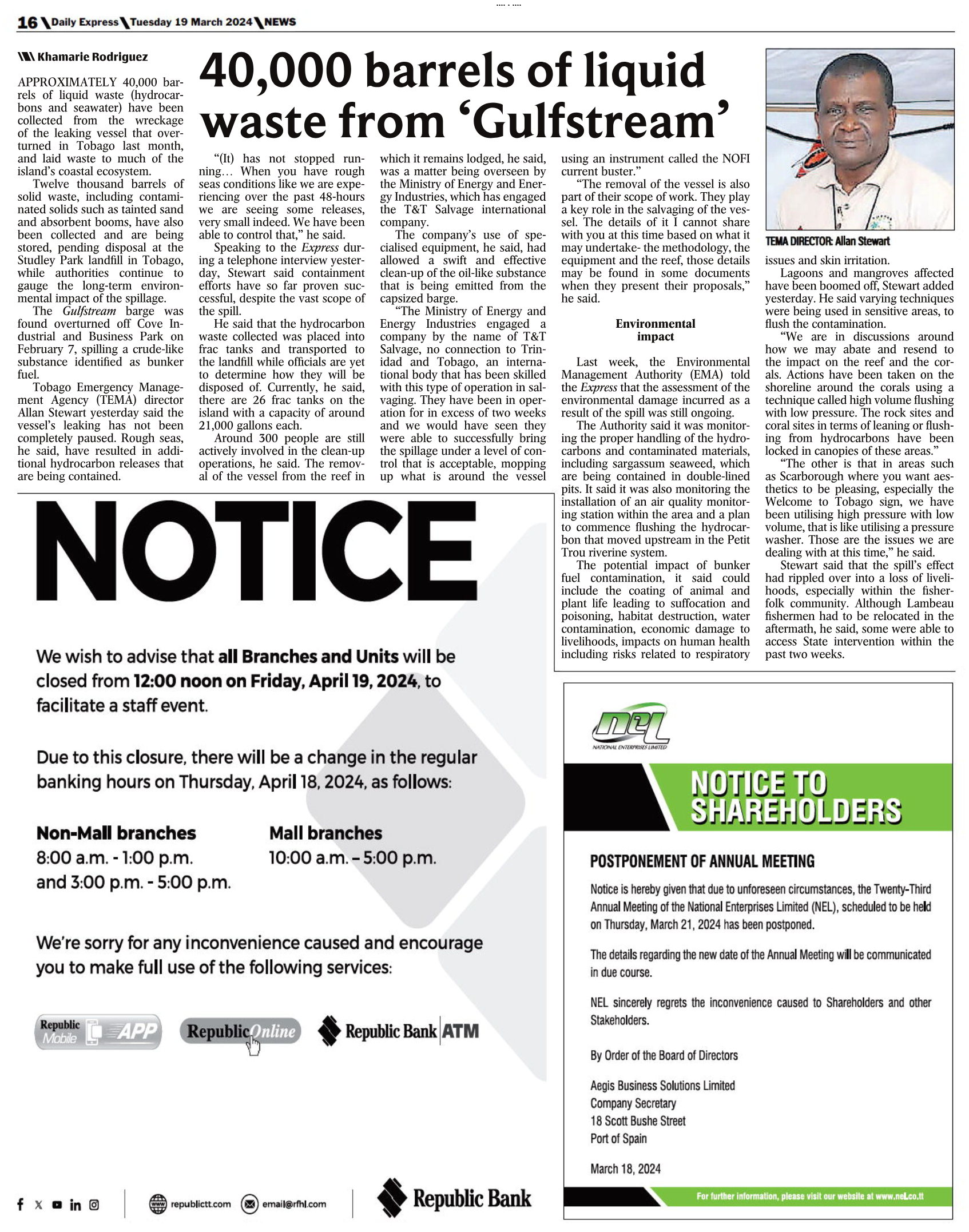 Twelve thousand barrels of solid waste, including contaminated solids such as tainted sand and absorbent booms, have also been collected and are being stored, pending disposal at the Studley Park landfill in Tobago, while authorities continue to gauge the long-term environmental impact of the spillage.