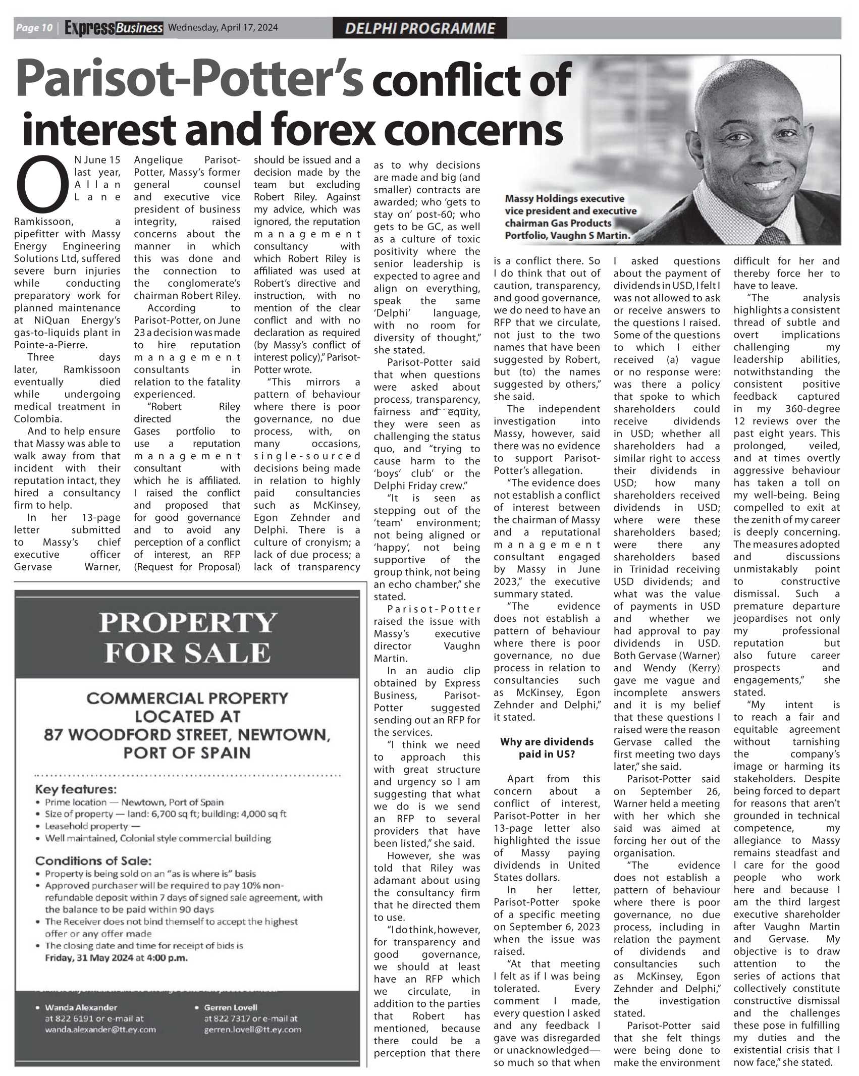 'Robert Riley directed the Gases portfolio to use a reputation management consultant with which he is affiliated. I raised the conflict and proposed that for good governance and to avoid any perception of a conflict of interest, an RFP (Request for Proposal) should be issued and a decision made by the team but excluding Robert Riley. Against my advice, which was ignored, the reputation management consultancy with which Robert Riley is affiliated was used at Robert's directive and instruction, with no mention of the clear conflict and with no declaration as required (by Massy's conflict of interest policy),' Parisot-Potter wrote.