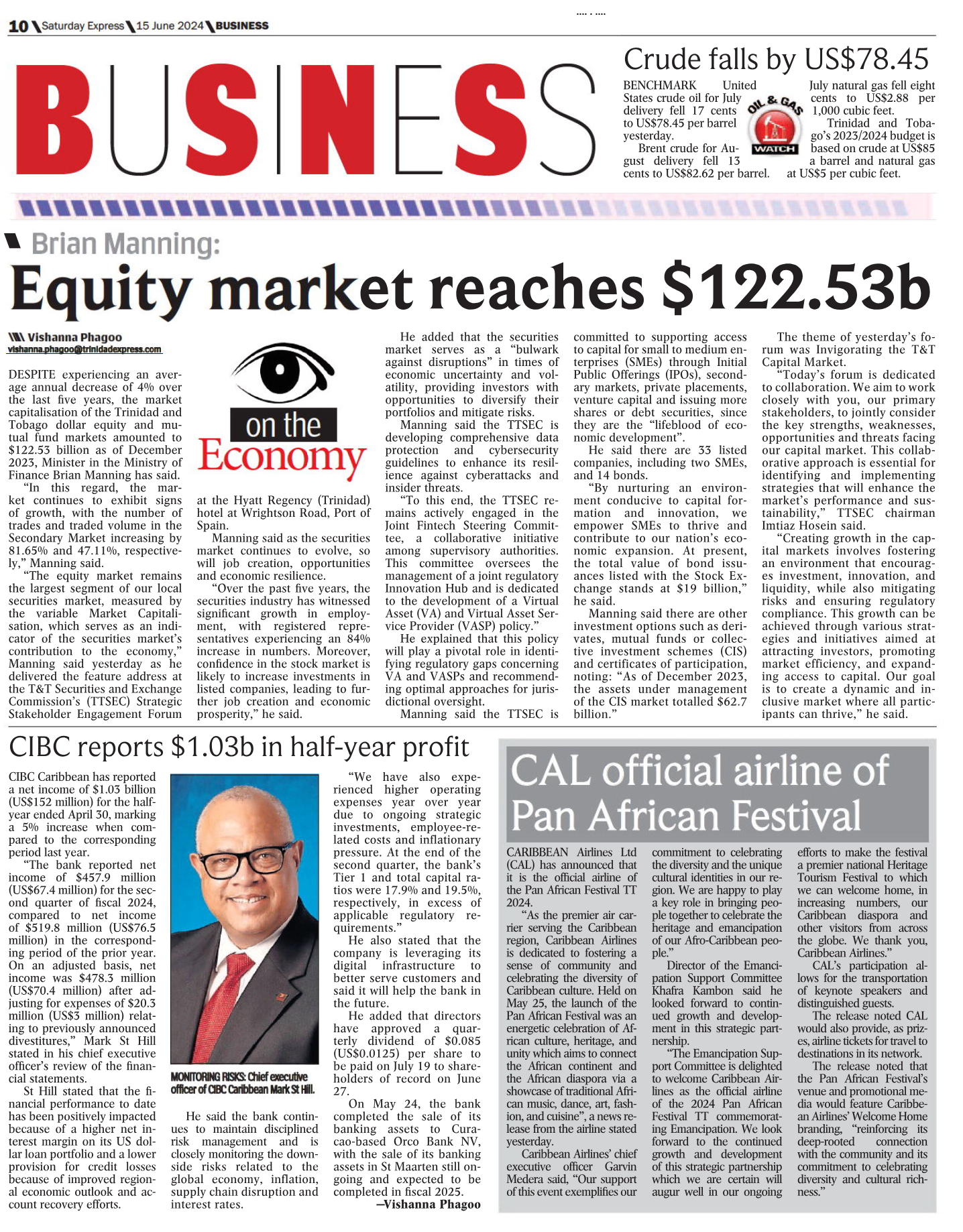 DESPITE experiencing an average annual decrease of 4% over the last five years, the market capitalisation of the Trinidad and Tobago dollar equity and mutual fund markets amounted to $122.53 billion as of December 2023, Minister in the Ministry of Finance Brian Manning has said.