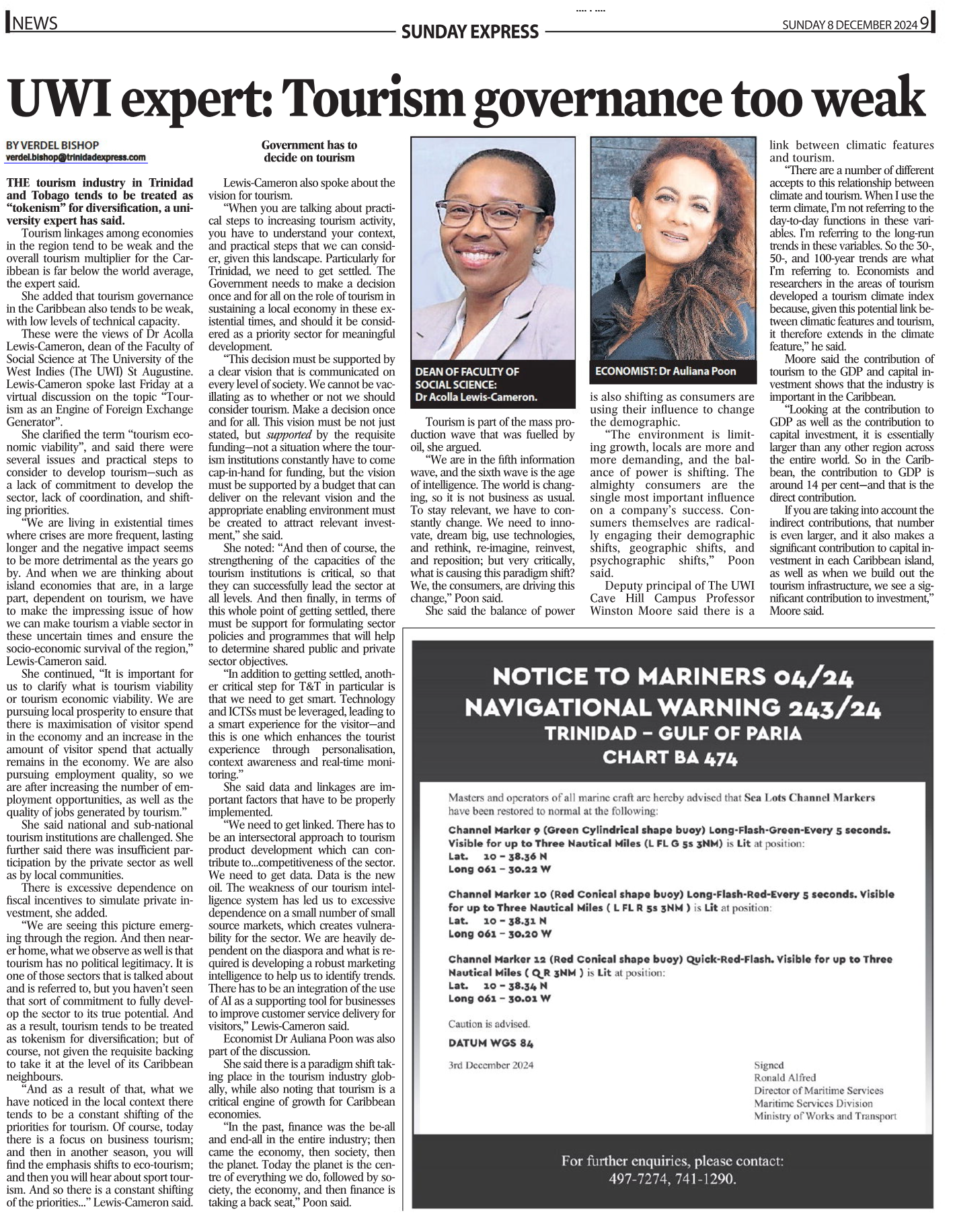 These were the views of Dr Acolla Lewis-Cameron, dean of the Faculty of Social Science at The University of the West Indies (The UWI) St Augustine. Lewis-Cameron spoke last Friday at a virtual discussion on the topic 'Tourism as an Engine of Foreign Exchange Generator'.